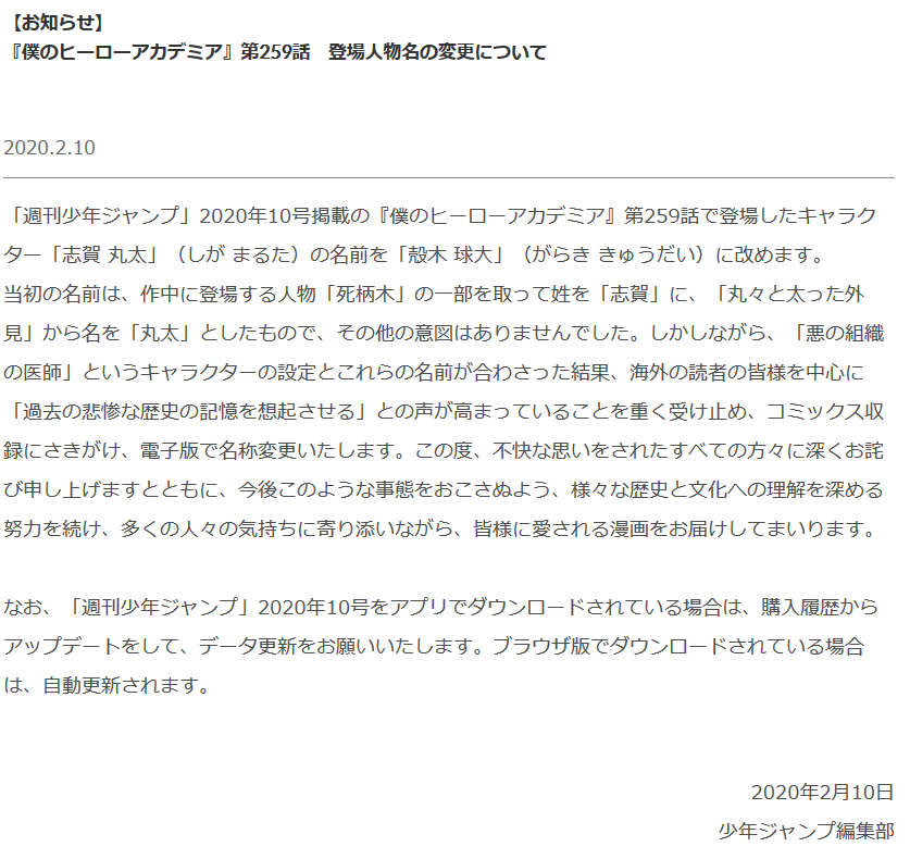 これを受けてジャンプ編集部は作者の堀越耕平氏とも協議の上、当該キャラの名前を変更し、コミックス版に先駆けて電子版はすぐに変更後の名前に差し替えました。